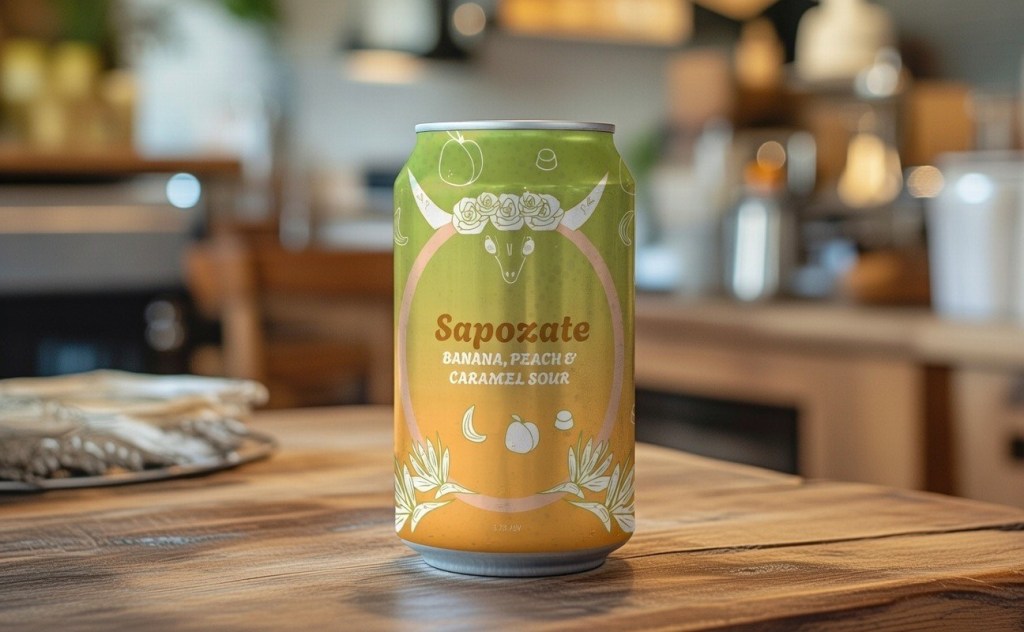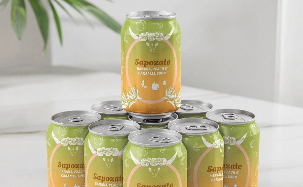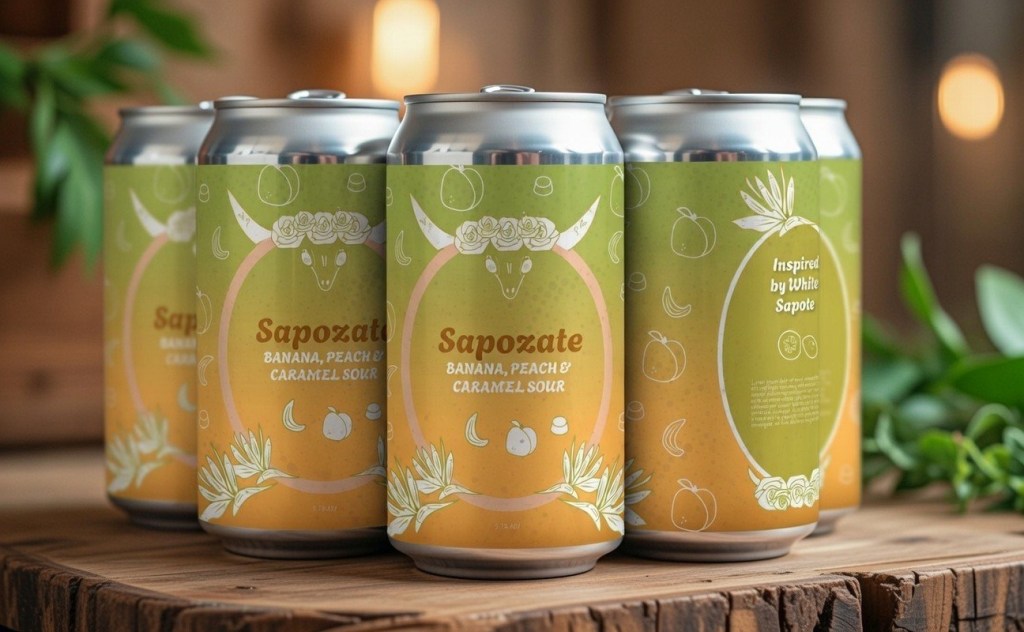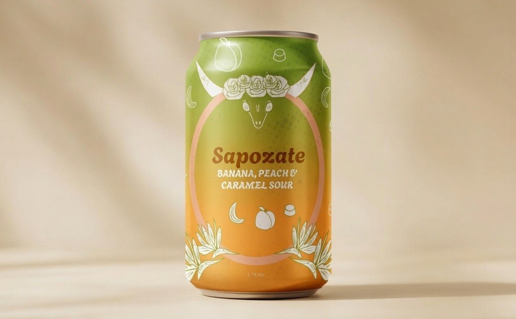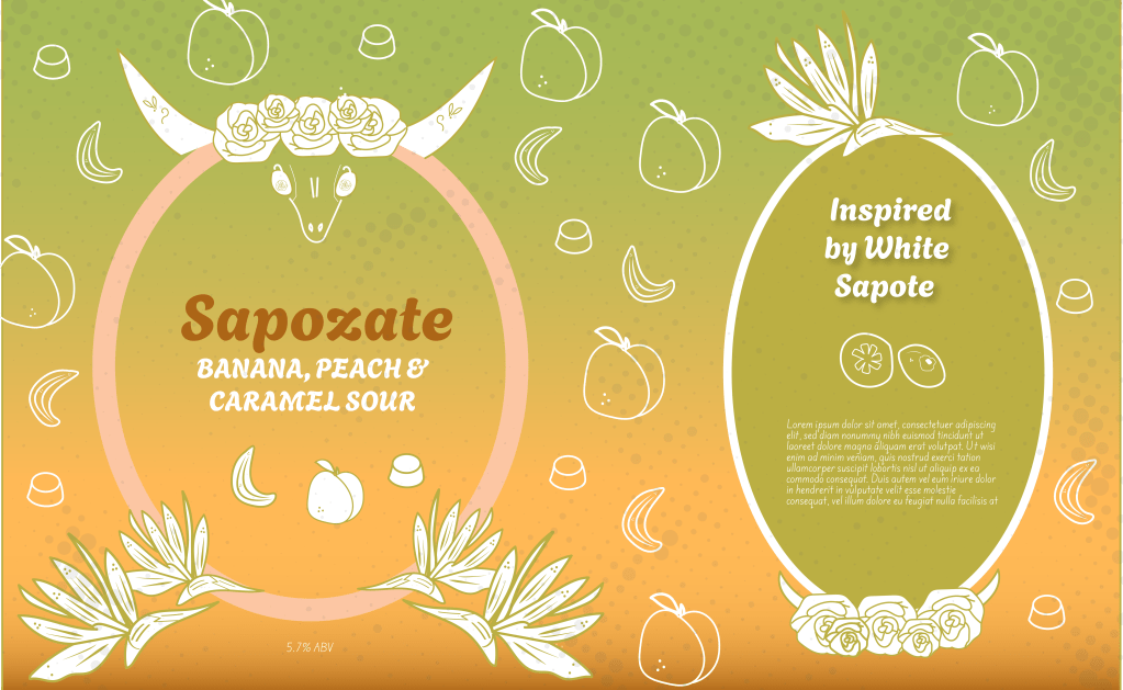 Furthermore, Sapozate is a banana, peach and caramel sour in the same beverage line, inspired by the Mexican fruit White Sapote. The illustration includes birds of paradise flowers, that symbolize liberation, transformation, and a higher spiritual state.